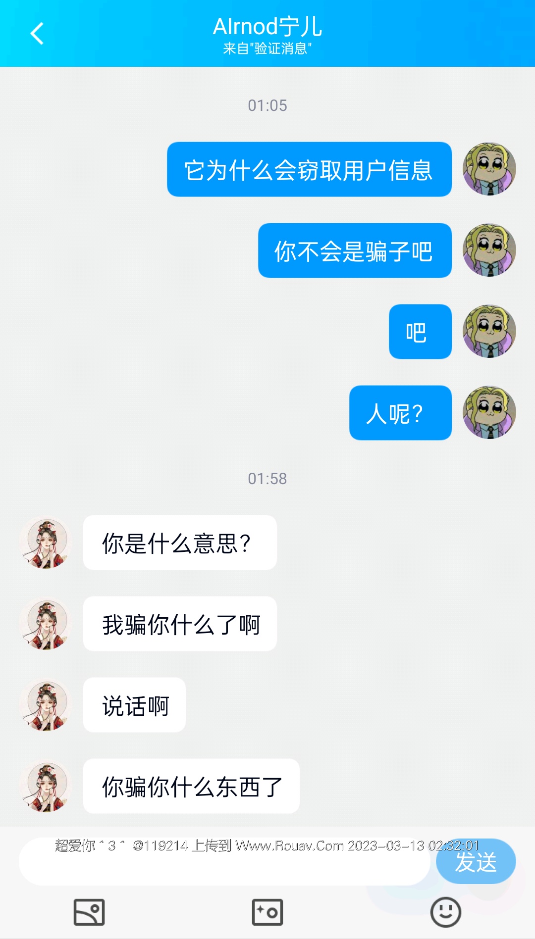 看到这个骗子破防了,真的很开心,至于为什么我那么确定他是骗子,因为它是有多个账号的,而且IP地址绝对是缅北,就光他IP地址这一点,你还愿意相信他吗?三个QQ都是他的 每一的作案方式都大同小异,首先问你在哪里?然后问你玩不玩sm,最后让你下载一个APP,盗取你的个人信息,咋把你的照片p成裸照,骗钱。还有如果你不是骗子的话,为什么在我怀疑你是骗子之后的一个小时才回我信息?并且没有做出任何解释
